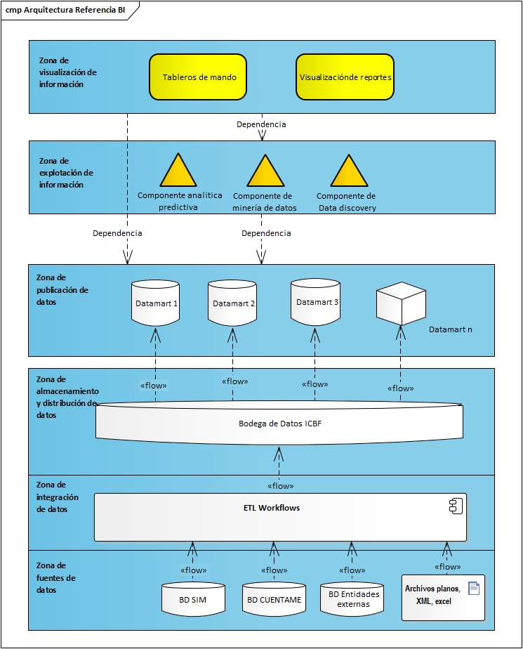La principal tarea de la Arquitectura de Referencia de BI es guiar a los arquitectos y desarrolladores en el proceso de convertir los datos provenientes de los sistemas misionales, sistemas de apoyo, entidades externas, y datos no estructurados provenientes de documentos físicos, videos, audios, redes sociales, etc. en información comprensible, útil, consistente, veraz; y así mismo está información sea fácilmente accesible por los usuarios de la entidad. La referida arquitectura de Referencia se encuentra documentada en el Anexo 13.
