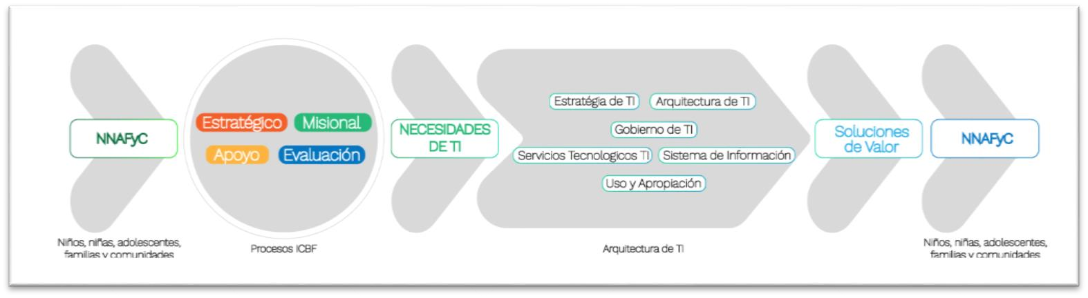 La siguiente cadena de valor de TI corresponde a un esquema general, el mapa de procesos contiene por cada uno que lo compone, el diagrama de proceso con todos los elementos que hacen parte de la caracterización de un proceso.